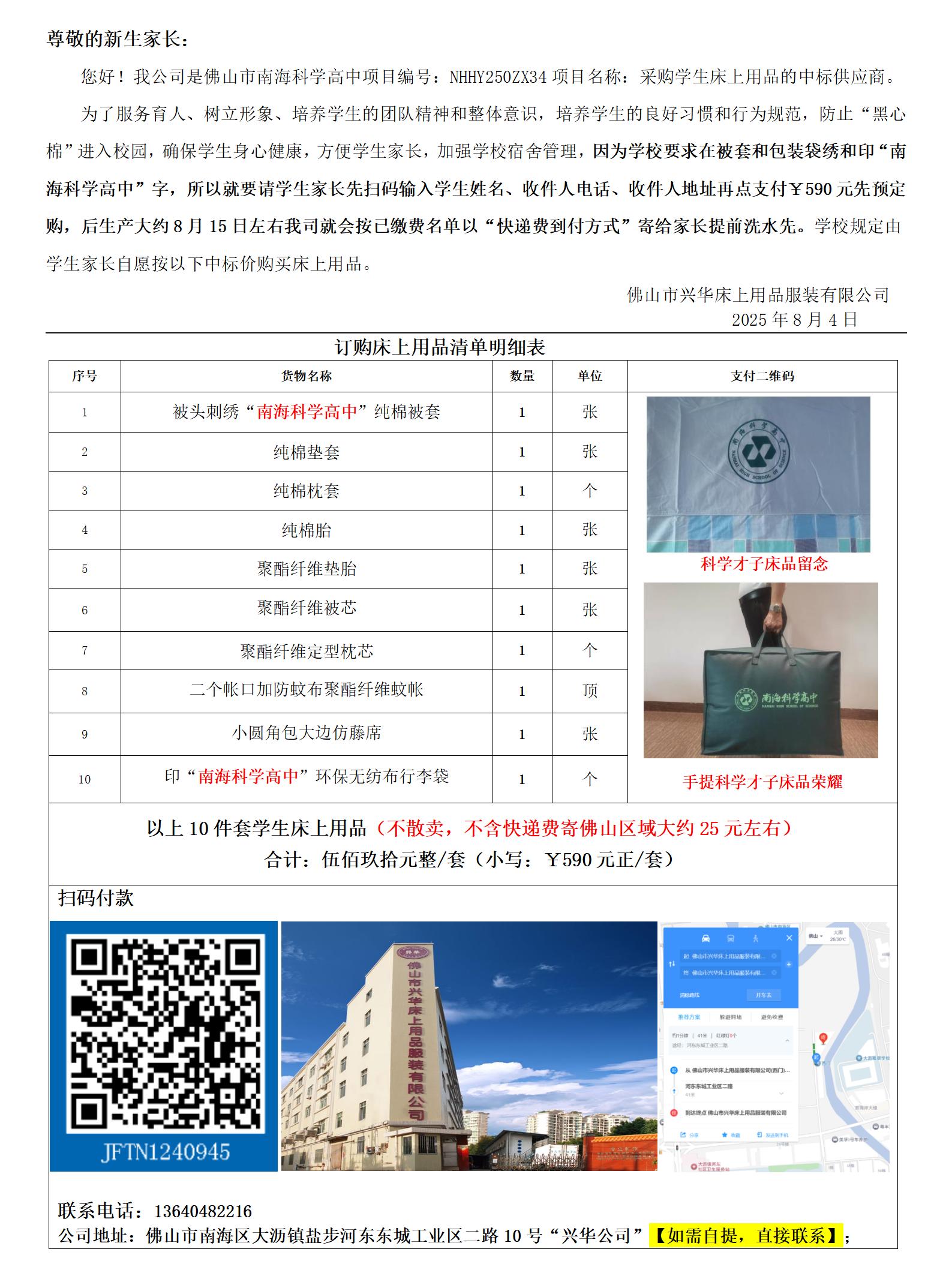 关于2028届高一新生2025年8月床上用品订购明细通知